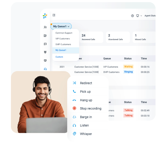 Provide all the tools your agents and supervisors need in one single web-based interface. The intuitive Queue Panel allows you to monitor queue traffic, check & switch agent status, and quickly conduct call operations like transfer, monitor, and parking with simple clicks.