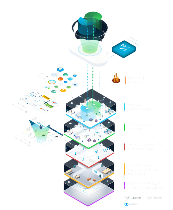 Our cloud engine turns your Cisco hardware (Catalyst, Meraki, WebEx) into sensors. And provides you with a full stack open framework: 3D rich maps, location meta-data, indoor location services (Wi-Fi, BLE), third party sensors, native apps, partner apps & meta API’s.